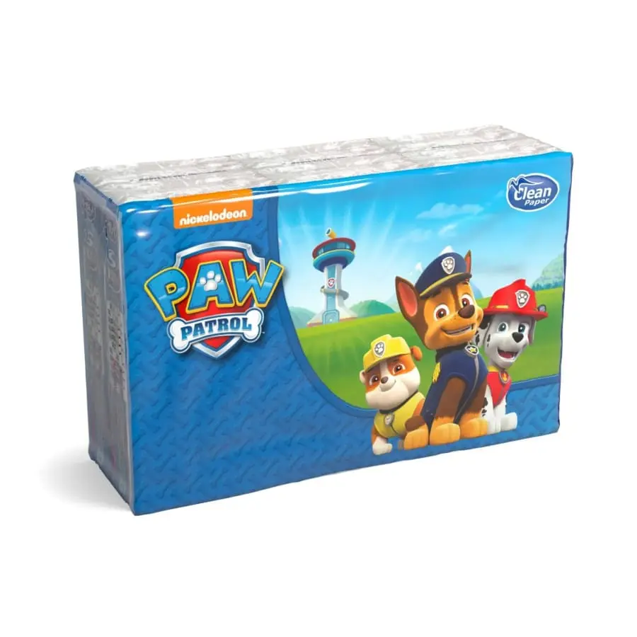 Paper handkerchiefs with a Paw Patrol theme. The product contains 6 classic pocket packs with 9 paper handkerchiefs each. The paper handkerchiefs have a slight vanilla scent.