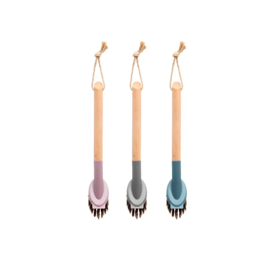 Wooden handle. Soft enough for silver, glass and crystal, yet still effective when washing pots and pans.