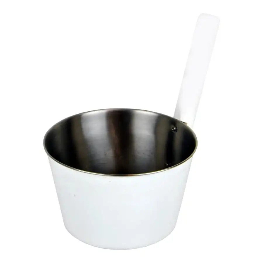 Saunabowl made of stainless steel with white out surface. With white wood handle