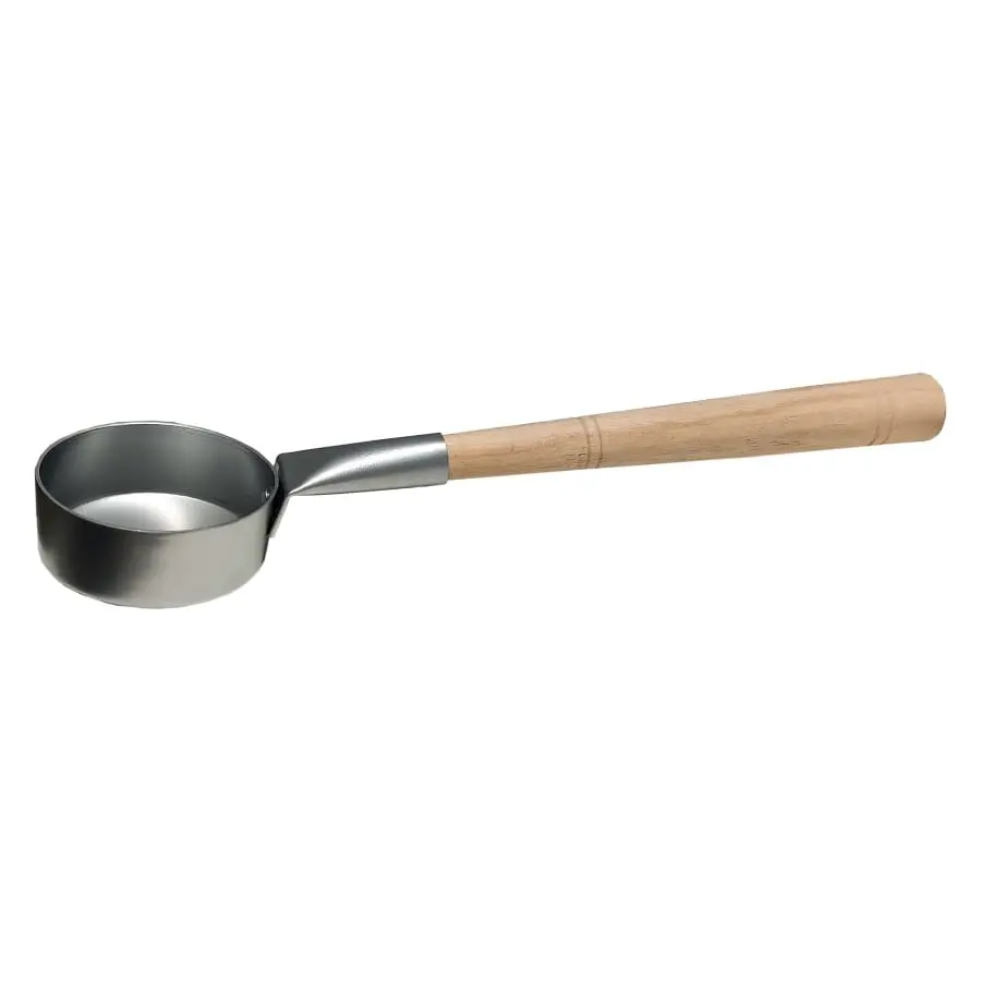 Saunaladle made of aluminium, cool siver color. With beech wood handle