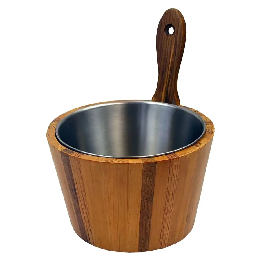 Saunabowl teak color wood with stainless steel cup. Volume 4 litres