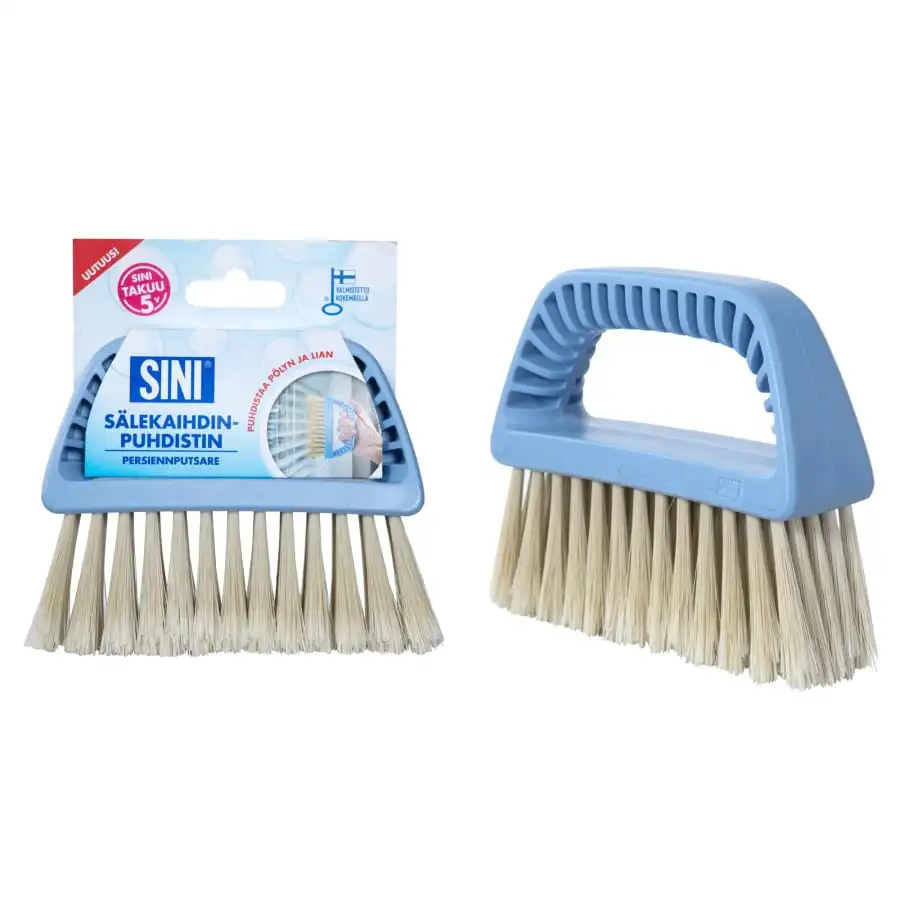 SINI Blindborste är ett lättanvänt och ergonomiskt verktyg för rengöring av både aluminium- och träfönstergardiner. Spetsen på det mjuka borstmaterialet är brutet, så det anpassar sig till persiennernas form särskilt exakt och borsten hamnar mellan persiennerna. Dessutom tar borsten bort små smutsfläckar från persiennerna och kan även användas för att rengöra fönsterspeglar. Nyckelflagga produkt tillverkad i Finland.