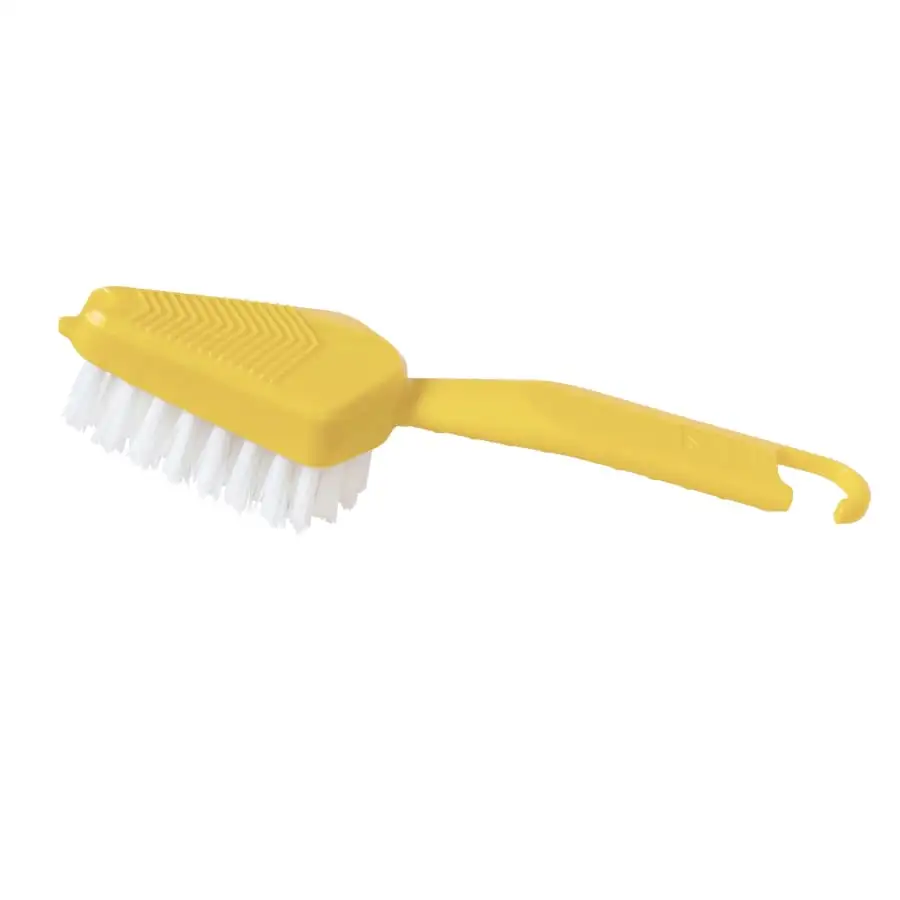 An efficient brush for washing potatoes and roots. Also suitable for washing fruit. The ergonomic handle provides a firm grip that protects the fingers. The snappy brush removes the peels easily. Bud remover on the end. Rinse the brush after use and hang it on a hook to dry. The brush can also be washed in the dishwasher. Suitable for home and cottage. Recycled plastic.