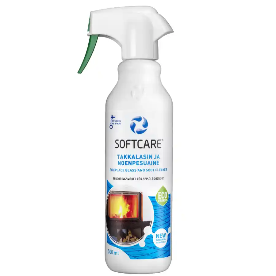 Softcaresoot cleaner for cleaning fireplace glass doors and other soot-stained surfaces. The product has been designed using new Softcare-technology, and it is efficient and environmentally friendly to use. The cleaner works on tough soot stains. Does not harm of scratch surface.