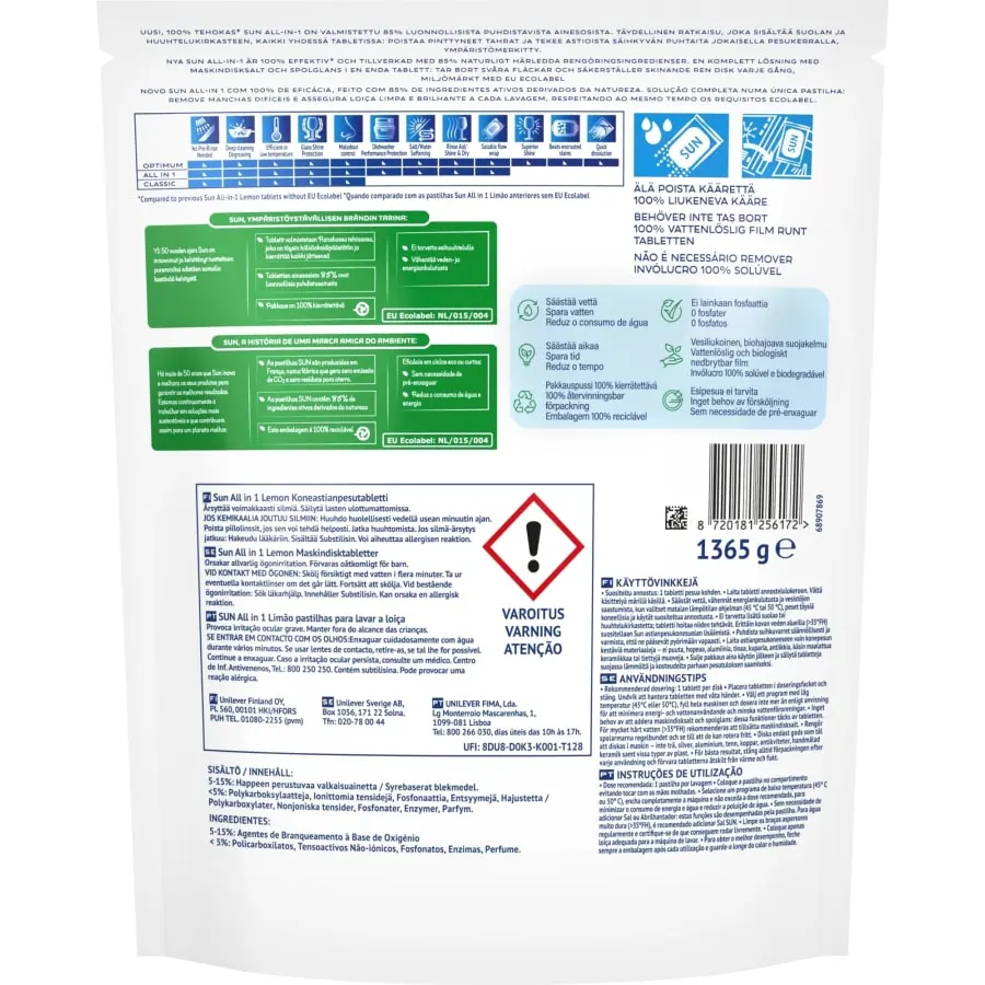 Den nya 100 % effektiva Sun All-in-1 är gjord av 85 % naturliga rengöringsingredienser. En komplett lösning som innehåller salt och sköljmedel, allt i en tablett: tar bort envisa fläckar och gör disken gnistrande ren vid varje tvätt, miljömärkt. 100 % upplösbar omslag. Förpackningen är 100% återvinningsbar.