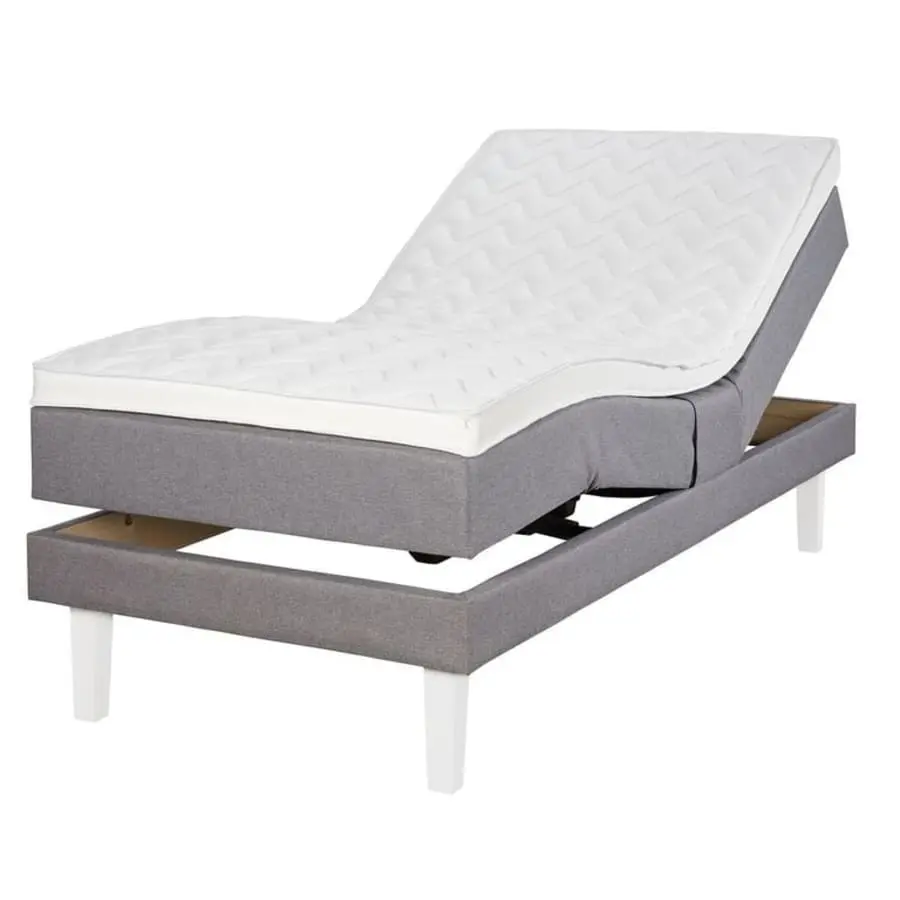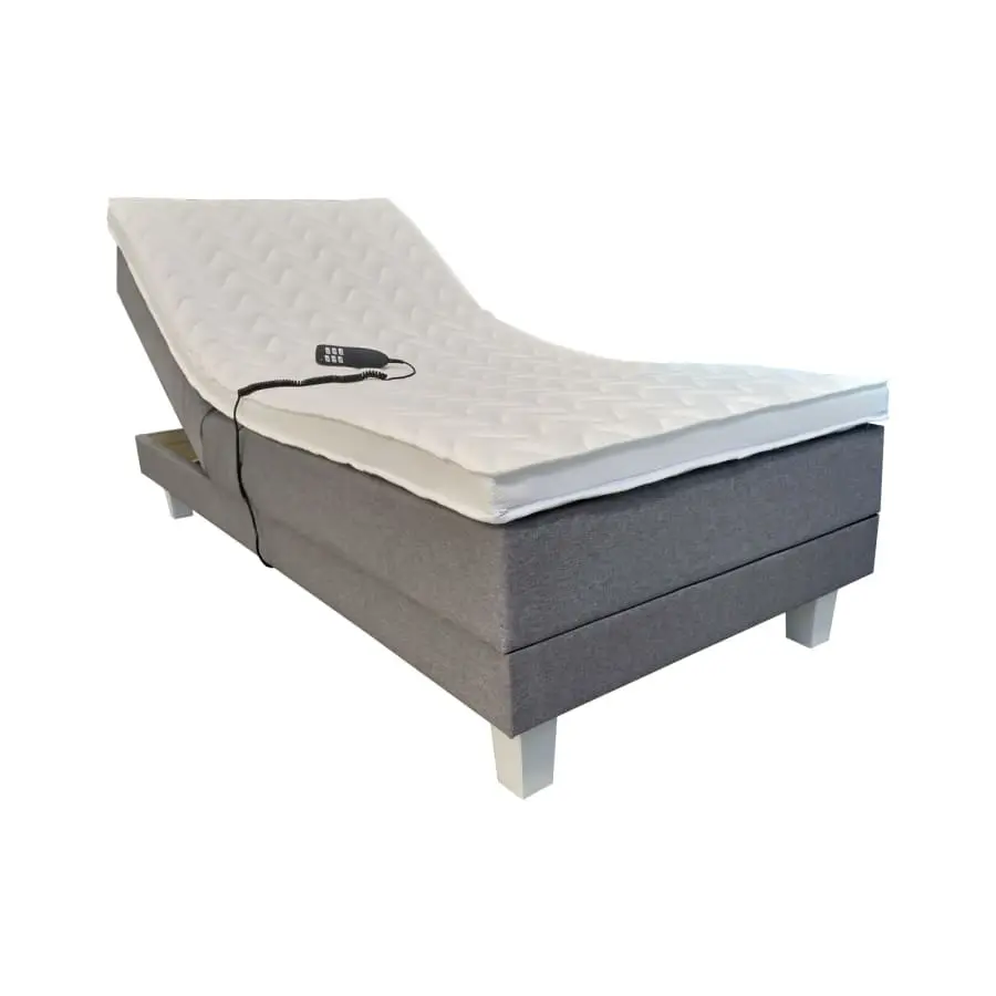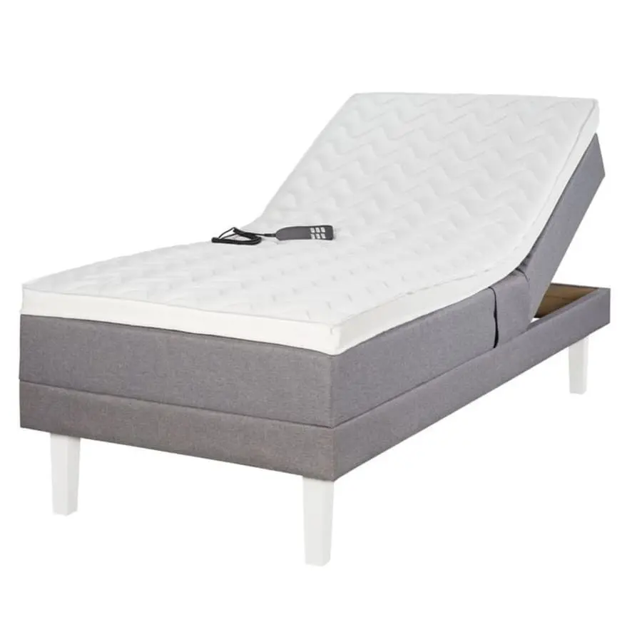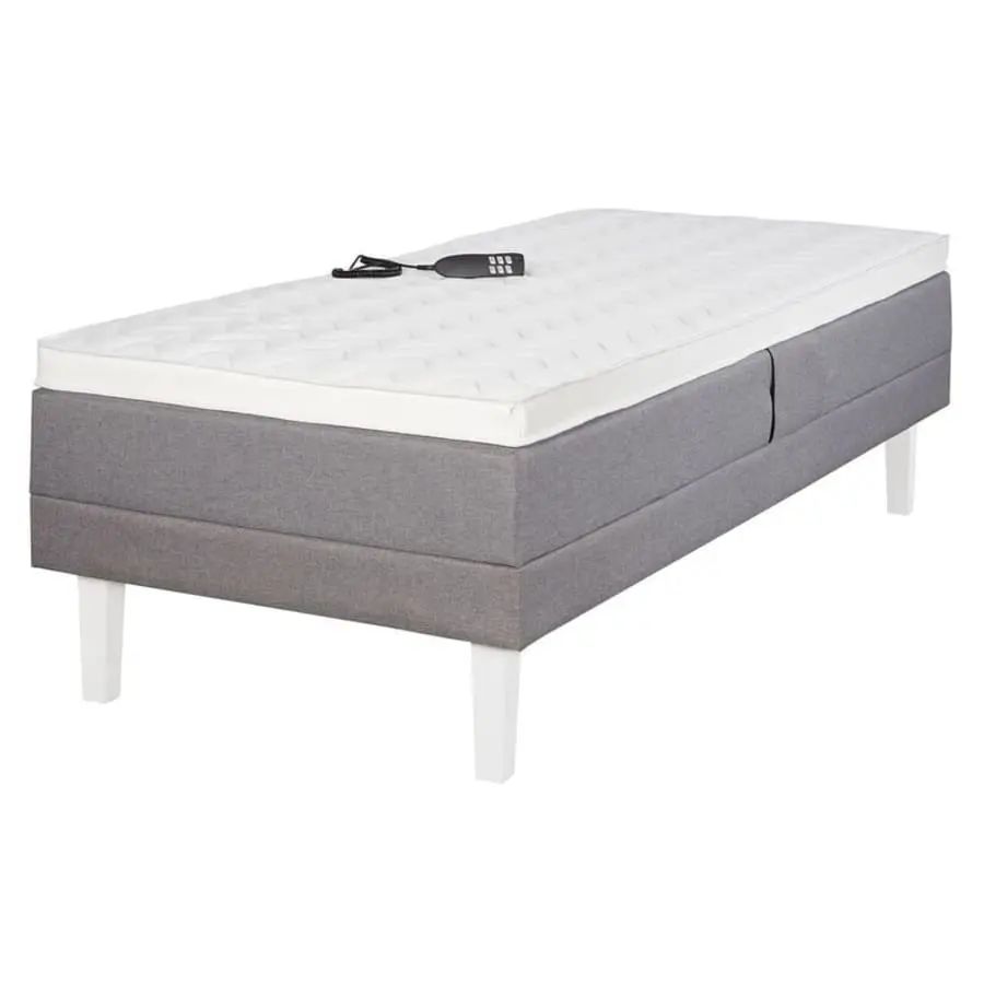 Sturdy solid wood frame, white painted wooden legs. (leg height 23cm) Frame upholstered Malmo no. 90 gray. Upper in white Stretch fabric. Pre-tensioned bag springs 270/m2, spring thickness 2mm. The sprung part is firmly integrated into the motor base. The mattress is upholstered with white stretch elastic fabric, the core is 5 cm thick 25 kg foam and the surface softness is 1 cm furniture wadding, the total height of the mattress is 7 cm. The adjustment base works with the help of two motors. 3-function stepless remote control, wired controller.